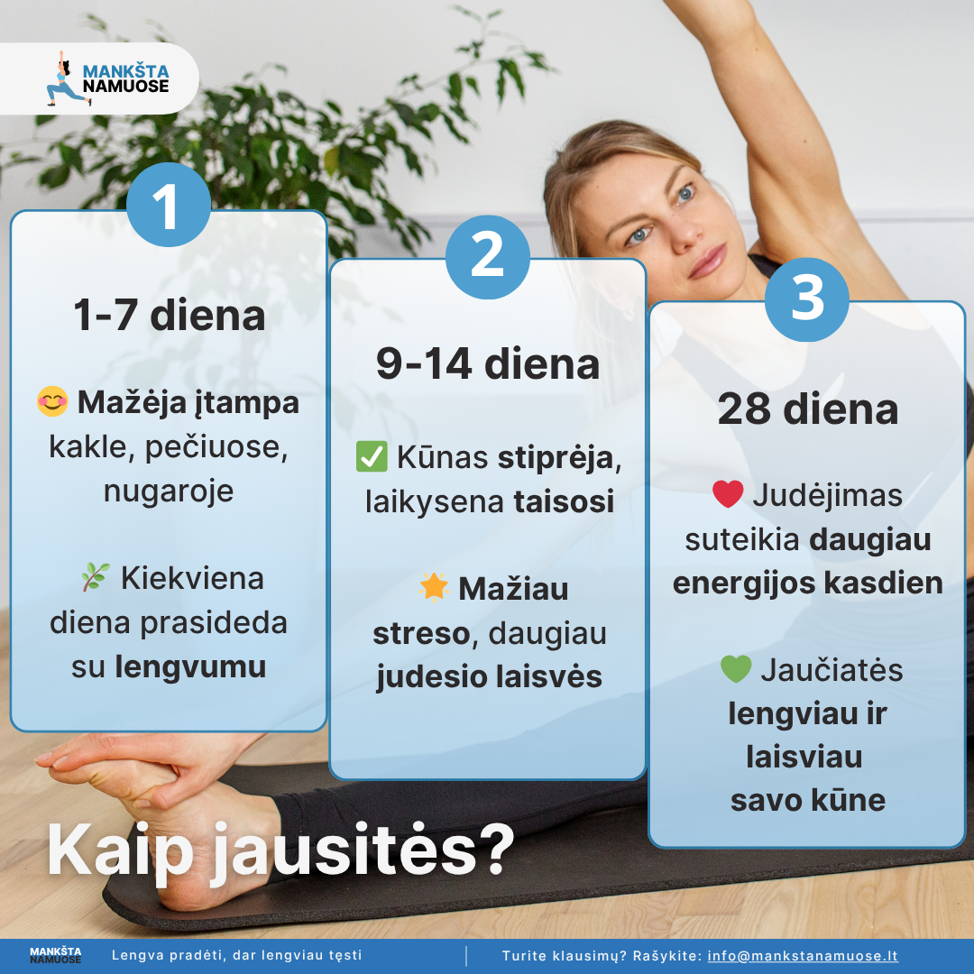 Kasdien jūsų laukia nauja 20 minučių švelni treniruotė, kurią galėsite atlikti jums patogiu metu – be įrangos, tiesiog namuose.