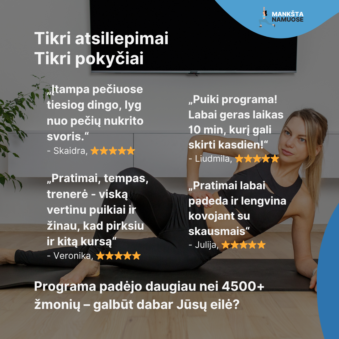 - Aiškius video su visais pratimais – viską veda kineziterapeutė;